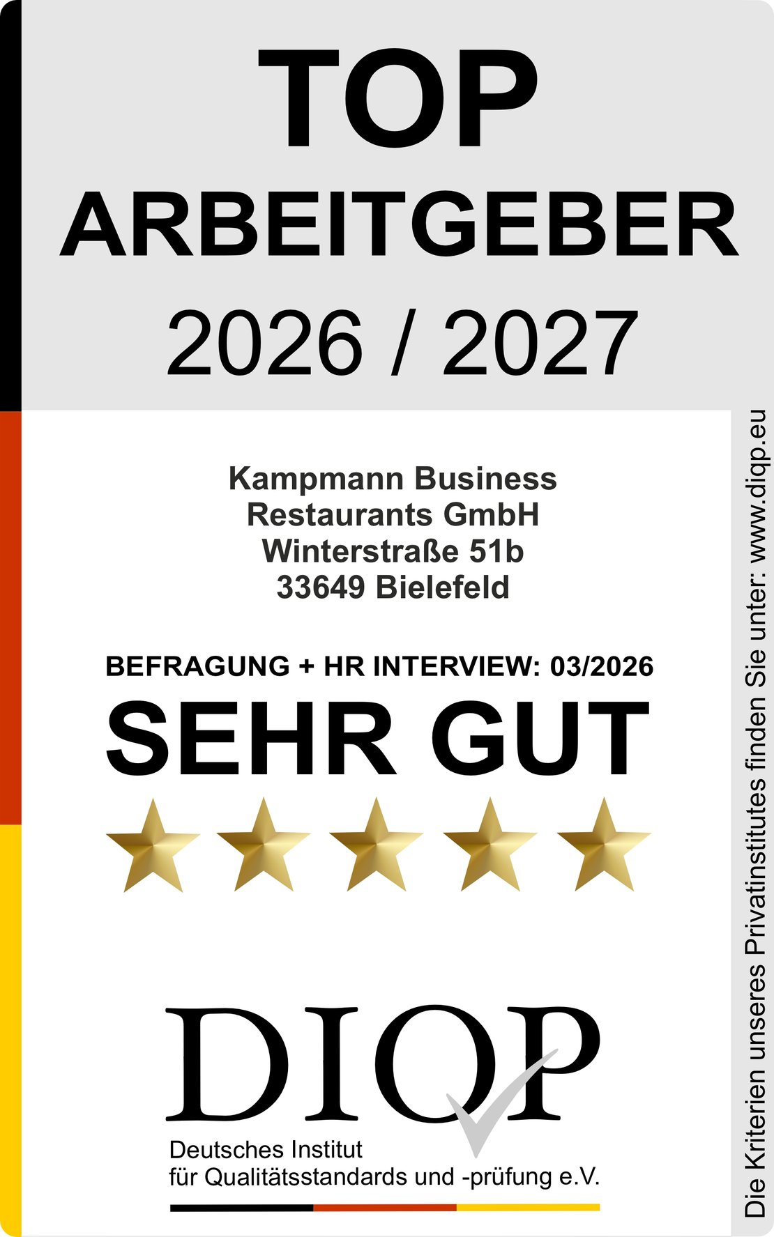 »Die Zertifizierung durch ein unabhängiges Institut ermöglicht uns nicht nur intern, sondern auch nach außen hin als attraktiver Arbeitgeber sichtbar zu werden. Wir sind ein Familienunternehmen, das diese Werte auch im Unternehmen lebt und unsere Mitarbeiter sehen wir als Mitglieder unserer Familie an. Dass wir als sehr guter Arbeitgeber bewertet wurden, freut mich sehr«, ordnet Bernhard Kampmann, Geschäftsführer der Kampmann Business Restaurants GmbH, ein.